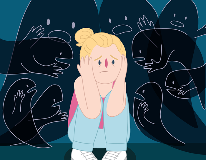 Young girl surrounded by voices