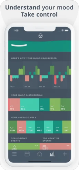 This app offers a really well designed, easy to use, and engaging mood tracking journal. There is an option to print PDF copies of user mood logs which can be useful for sharing with face-to-face Counselling Professionals, and a choice of mood rating scales that helps provide a more accurate indication of user mood.