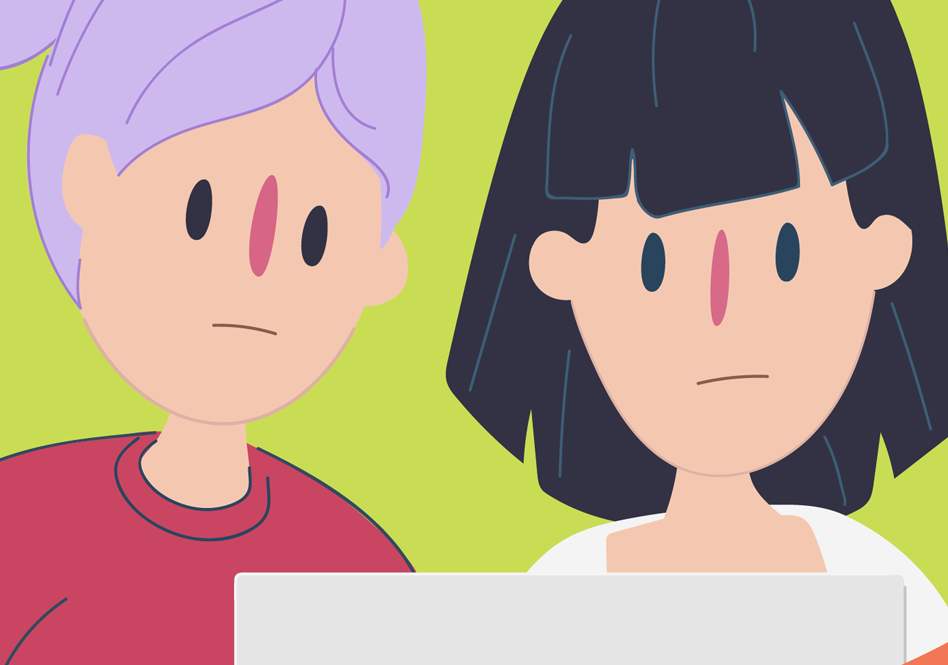 Two girls looking at laptop with exclamation point