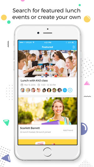 Encourages kids to create lunch events with people they know (from school or people around them etc) so that no one ever needs to sit alone at lunch. Good concept for an app - theoretically though, it could be misused.