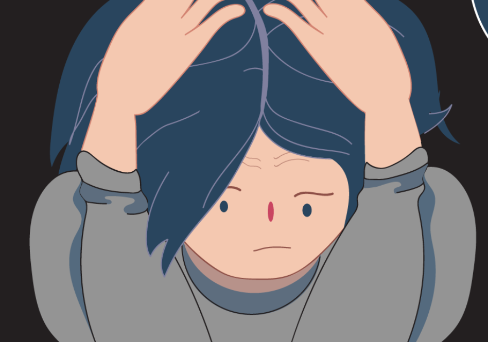 Teen boy sitting with his head in his hands surrounded by thoughts of different substances