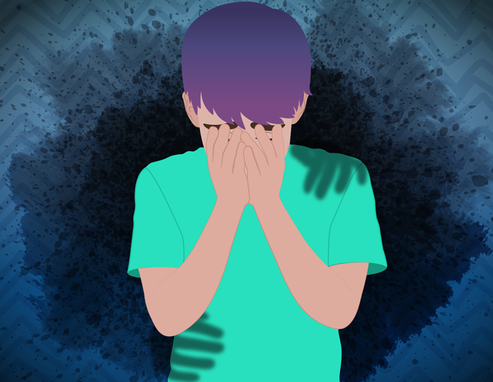 Teen boy with head in hands with shadows behind him, including two hand marks on his shoulder and waist